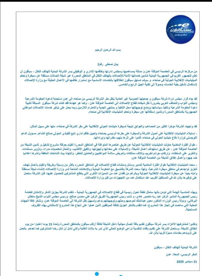 من مركزها الرئيسي في العاصمة المؤقتة عدن و ممثلة بمساهميها ومجلس إدارتها وطاقمها الإداري و الوظيفي يسر الشركة اليمنية للهاتف النقال – سبأفون أن تعلن للجمهور الكريم في الجمهورية اليمنية تدشين خدماتها الأمنة للإتصالات بالهاتف النقال في المناطق المحررة عبر شبكة إتصالات مستقلة عن سيطرة وتحكم الميليشيات الإنقلابية الحوثية في صنعاء، و سوف تستهل سبأفون إنطلاقتها بالخدمات الأساسية مع إستمرار طاقمها في الأعمال الحثيثة مع وزارة الإتصالات لإستكمال تشغيل بقية الخدمات وصولاً إلى تقنية الجيل الرابع والخامس.