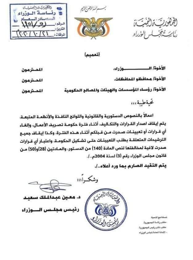 وقال رئيس الوزراء، في تعميم له بتاريخ 21 /10/ من الشهر الجاري، حصل “يمن بوست” على صورة منه: “إعمالاً بالنصوص الدستورية والقانونية واللوائح النافذة والأنظمة المتبعة، يتم إيقاف إصدار القرارات والتكاليف أثناء فترة حكومة تصريف الأعمال، وإلغاء الترشيحات المتعلقة بطلب التعيينات، حتى تشكيل الحكومة”.