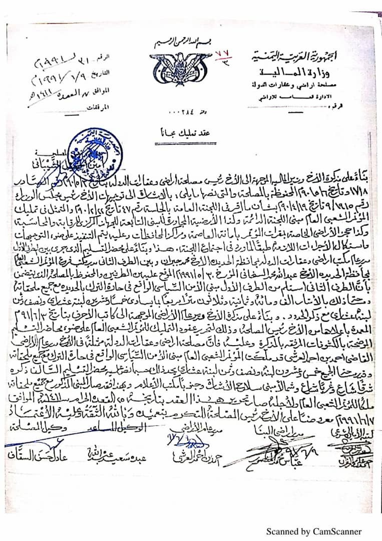 وأظهرت مذكرة صادرة امين عام مؤتمر الحديدة، غازي احمد علي محسن، وموجهة إلى رئيس الهيئة العامة للأراضي والمساحات والتخطيط العمراني بعقد تمليك صادر من مصلحة أراضي وعقارات الدولة.