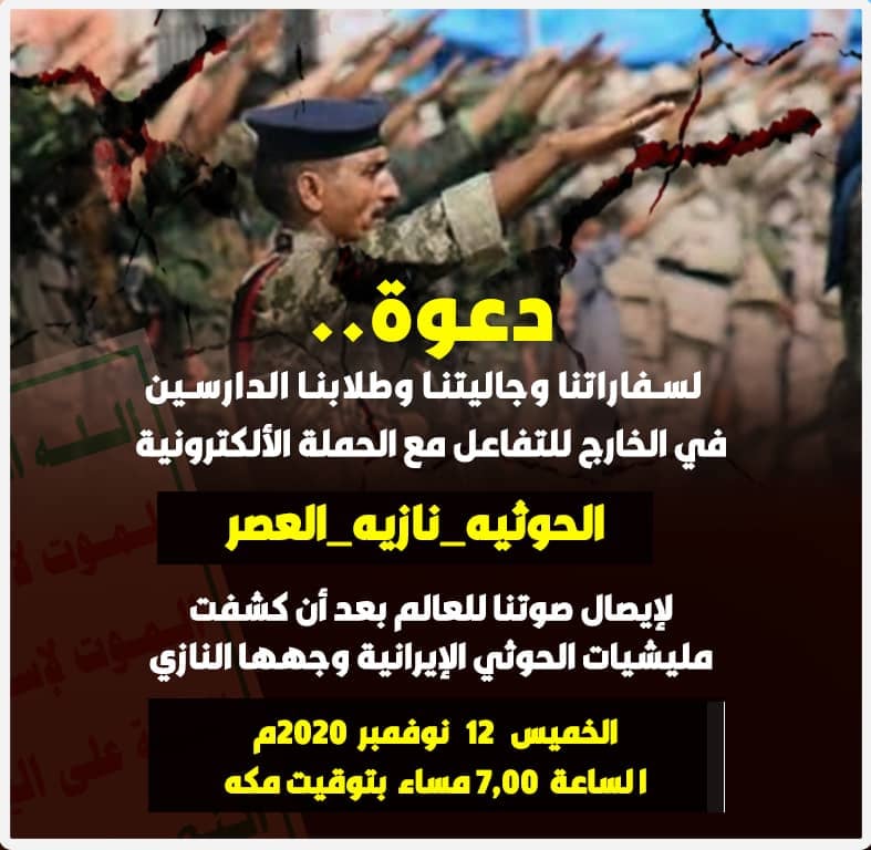 Yemenis organize three-Language online campaign advocating their right to get rid of Houthi Nazism A massive online electronic campaign in Arabic, English and Germany Languages doubed as “Houthis are the Nazis of present era” will be kicked off by Yemeni people on all social media platformd at 7:00 pm on Thursday. The campaign key aim is to convey voice of Yemeni people to the whole world and expose the Iran- backed Houthi terrorist ugly criminal face through adopting the Nazi military approach. It is also to indicates that survival of Houthi militia has become a threat to the world peace if the international community continues its complicity and silence over Houthi terrorist crimes. The campaigners also seek to send a call to all those interested in Yemeni affairs from across the world- politicians, diplomats, journalists, media proffessionals, writers and activists, and all media platforms- to interact and takepart locally and broadly with this campaign in order to win and advocate for right of the Yemeni people to end the Nazi ( Houthi) coup that Iran stands for and supports. It stresses that Yemenis, like the rest of the world, deserve to live in peace, freedom, and security, after these militia caused the world’s largest human tragedy. Campaign hashtag: #Houthis_are_Nazis_of_present_era Campaign launching : 7:00 pm on Thursday.
