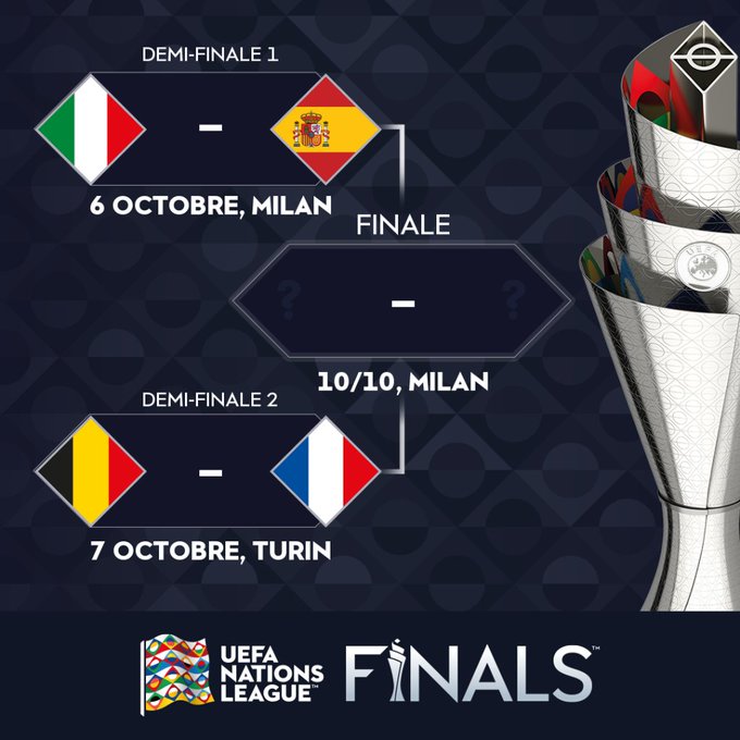 وأسفرت القرعة عن مواجهة المنتخب الإسباني لنظيره الإيطالي وستجري المباراة بينهما في الـ6 من أكتوبر المقبل في مدينة ميلان، فيما يلتقي في نصف النهائي الثاني بعدها بيوم منتخبا فرنسا وبلجيكا في مدينة تورينو.
