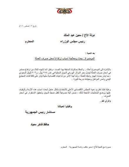 واقترح على رئيس الجمهورية تشكيل لجنة عليا تضم كلا من نائب الرئيس ورؤساء مجلسي النواب والشورى والحكومة ومدير مكتب الرئيس ووزير المالية ومحافظ البنك المركزي وذلك لمتابعة وضع العملة الوطنية وإيجاد الحلول المناسبة لوقف تدهور قيمتها ومعالجة مكامن الخلل وأسباب.