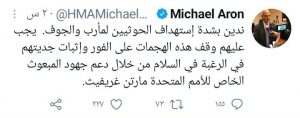 وكتب تغريده عبر حسابه في تويتر “ندين بشدة استهداف الحوثيين لمأرب والجوف، يجب عليهم وقف هذه الهجمات على الفور وإثبات جديتهم في الرغبة في السلام من خلال دعم جهود المبعوث الخاص للأمم المتحدة مارتن غريفيث”.