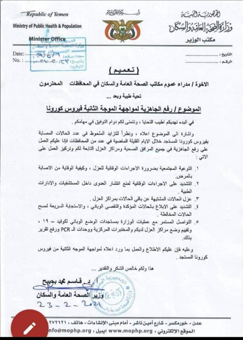 حذرت وزارة الصحة العامة والسكان بالحكومة اليمنية من إنتشار موجة جديدة من فايروس كوفيد 19.