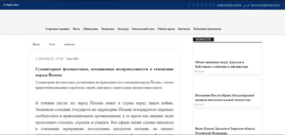 وقال ردفان الماس رئيس رابطة الطلاب اليمنيين في روسيا لـ”منصة26سبتمبر”،أن”قيادات في السفارة الإيرانية وجهت دعوات لطلاب يمنيين لحضور معرض فني نظمته السفارة الإيرانية،أسمته “جرائم العدوان والمرتزقة في اليمن”.