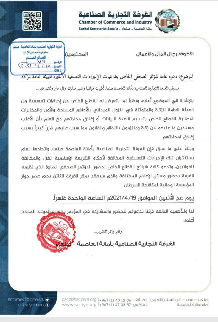عبرت الغرفة التجارية الصناعية بأمانة العاصمة صنعاء وإتحادها العام الخاضعة لسيطرة مليشيا الحوثي الإنقلابية عن تنديديها وأستنكارها بالإجراءات التعسفية الأخيرة للهيئة العامة للزكاة الحوثية بحق القطاع الخاص .