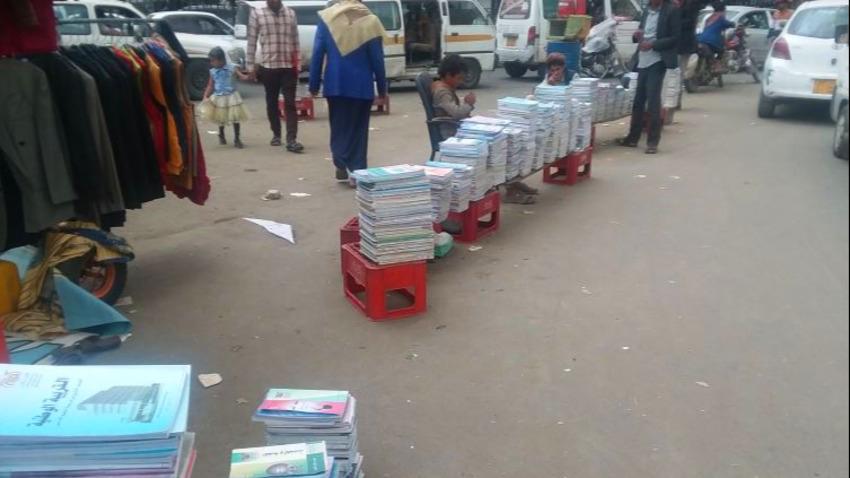 مراقبون أكدوا أن الميليشيا تقوم بيع الكتاب المدرسي عبر مجموعة من وكلاء البيع الذين يرتصّون بالقرب من ميدان التحرير في قلب العاصمة المحتلة صنعاء.