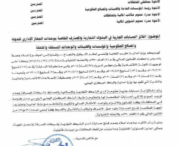 جاء ذلك، في تعميم، وجهه وزير المالية، للوزراء ومحافظي المحافظات، ورؤساء الهيئات والمؤسسات والمصالح الحكومية. ومديري عموم مكاتب المالية بالمحافظات بإغلاق الحسابات الجارية لدى البنوك التجارية والإسلامية وشركات الصرافة الخاصة.
