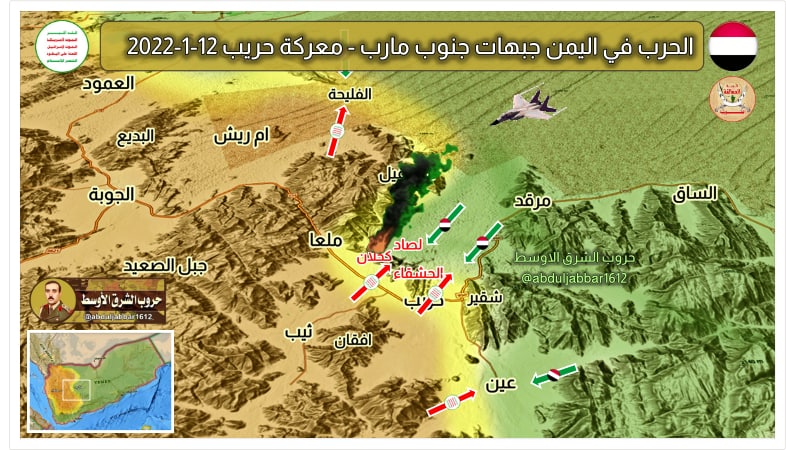 وأضافت: أن المعارك تركزت في جبهتي لصاد، وكحلان، شمال مدينة حريب، وبجبهتي الحشفا والقانع، في القلب. وكذلك في جبهتي المناحيز، والسوداء، إلى الجنوب المدينة. وهي المحاور الثلاثة التي تتقدم من خلالها قوات العمالقة صوب مركز المديرية.