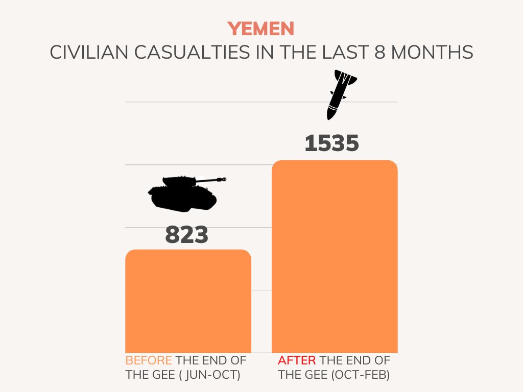 وبحسب مشروع مراقبة الأثر المدني، التابع للمجلس، فإن مجموع الضحايا المدنيين: (7 حزيران – 6 تشرين الأول) = 823 (7 تشرين الأول – 6 شباط) = 1535. إجمالي ضحايا الغارات الجوية: (7 يونيو – 6 أكتوبر) = 14 (7 أكتوبر – 6 فبراير) = 547. كما أن إجمالي الخسائر البشرية في ضربات الطائرات بدون طيار: (7 يونيو – 6 أكتوبر) = 3 (7 أكتوبر – 6 فبراير) = 30.