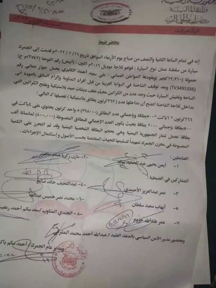 وأظهرت وثيقة صادرة عن المنفذ أنه فإنه تم ضبط مواطن يدعى؛ علي سعيد احمد الكثيري، يحمل الجنسية العُمانية، وبحوزته 800 ألف بطاقة تحمل شعار الجمهورية اليمنية.