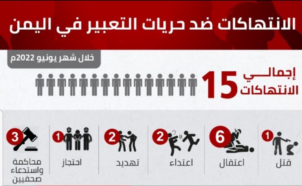فخلال شهر يونيو الماضي سجل مرصد الحريات 15 حالات انتهاك تنوعت بين حالة قتل واحده و 6 حالات اعتقال و 2 حالتي اعتداء و2 حالتي تهديد و حاله احتجاز واحدة و 3 حالات محاكمة واستدعا صحفيين .