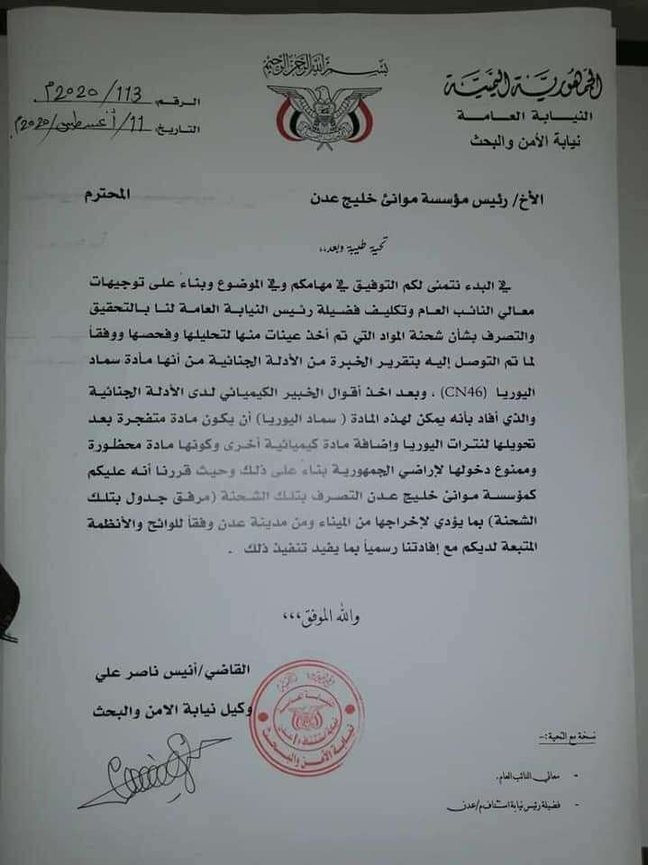 حيث جاء في مذكرة موجهة من وكيل نيابة البحث والأمن، إلى رئيس مؤسسة موانئ خليج عدن، أنه “بناءً على توجيهات معالي النائب العام، وتكليف رئيس نيابة عدن بالتحقيق والتصرف بشأن شحنة المواد التي تم أخذ عينات منها لتحليلها وفحصها، ووفقاً لما توصل إليه تقرير الخبراء من الأدلة الجنائية من أنها سماد اليوريا (CN46)، وبعد أخذ أقوال الخبير الكيميائي الذي أفاد بأنها يمكن أن تتحول إلى مادة متفجرة بعد تحويلها لنترات اليوريا وإضافة مادة كيمائية أخرى عليها، وكونها مادة محظورة وممنوع دخولها لأراضي الجمهورية، قررت نيابة البحث والأمن بعدن التوجيه إلى مؤسسة موانئ خليج عدن بالتصرف بالشحنة المخزنة بالميناء، وبما يؤدي إلى إخراجها من مدينة عدن ومينائها”.