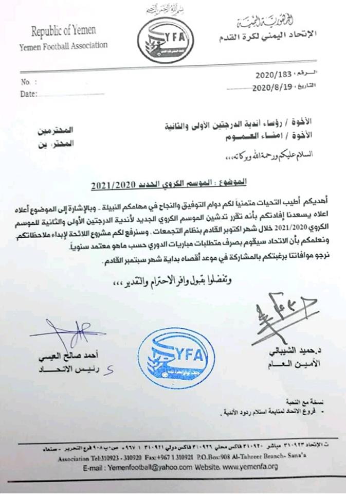 وأقرت الأمانة العامة للاتحاد توجيه خطاب للأندية حصل عليه محرر مانشيت وأكدت من خلاله أنه تقرر إنطلاق الموسم الكروي الجديدخلال شهر اكتوبر القادم بنظام التجمعات،وهو نفس النظام الذي أقيمت من خلاله منافسات الدوري التنشيطي العام الماضي 2019م كأول منافسات رسمية للاتحاد منذ نهاية 2014