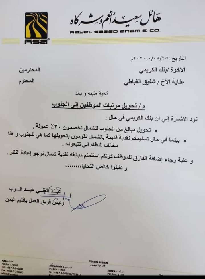 و في الرسالة تطالب الشركة بنك الكريمي بإيضاحات حول استلام موظفين لها في صنعاء دفعت رواتبهم في الجنوب خصم منهم ٣٠ في المائة في حين ان تم العكس لا يتم زيادة الموظف في الراتب..